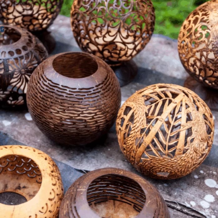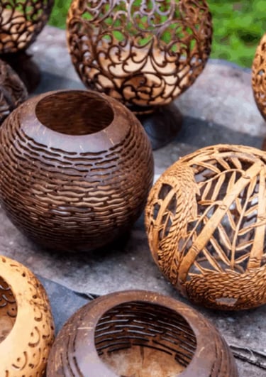 Natural products made from coconut shell and fiber, combining traditional craftsmanship with sustainable design.